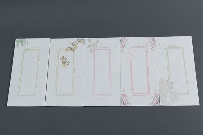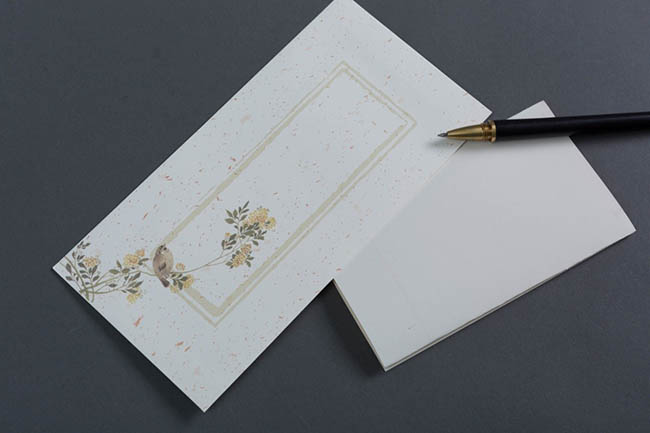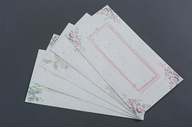 每套5个,每个信封均带水印花卉,共5种图案,取材自芥子园画谱的芙蓉、牡丹、丽春花、茶梅、水仙等,设色淡雅,凭添书香芳华,这套信封不但精致还蕴含中国书画代表的元素,与对应的信纸配套使用相得益彰。