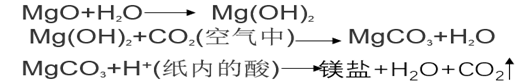 无论是液态的水还是潮湿的空气,氧化镁颗粒都可与水高度反应而生成氢氧化镁。分布在纸内的氧化镁颗粒接触到纸内的水分和空气中的水汽后即形成氢氧化镁,后又在空气中二氧化碳的作用下,氢氧化镁转变为碳酸镁。碳酸镁遇到纸内的酸,酸中的氢离子就被碳酸根(CO32-)俘获,中和反应由此产生。以下为简要的化学反应过程。
