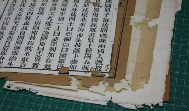 在具体修复工作开展后,上海图书馆古籍修复团队遇到了不少新困难、新阻力。由于年代久远,《瀛环志略》原书六册的破损病害情况包括虫蛀、磨损、污渍、撕裂、老化及变色现象,部分出现了黄褐色氧化斑。按照“整旧如旧”的原则,上海图书馆古籍修复技艺传习导师张品芳与青年修复师吕迎吉、陈茜、张舒组成的项目修复团队,对该书开展修复,但最初的情况并不顺利,其中最困难的点就是书籍可能因受潮而不平整,书头和书脚呈波浪形,书口和书背除有波浪形之外,还存在书叶参差不齐的现象。以往遇到这种情况,通常用压书机将纸张压平即可,但修复《瀛环志略》没那么容易——这些纸张从压书机里拿出来后,过了一段时间又逐渐恢复到此前的波浪形状态。“团队里对这种情况都很恼火。” 张品芳笑着向记者介绍当时的情况。