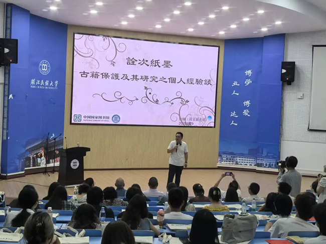 9月29日,由国家图书馆(国家古籍保护中心)主办,湖北省图书馆(湖北省古籍保护中心)承办,湖北民族大学图书馆、恩施州图书馆协办的“古籍保护课程进校园”活动走进湖北民族大学。国家图书馆研究馆员向辉以“诠次纸墨:古籍保护及其研究之个人经验谈”为题在湖北民族大学图书馆二楼报告厅作专题讲座。向辉老师结合自身参与“中华古籍保护计划”的实践,系统阐述了古籍保护工作的重要意义、主要内容及已取得的成效,并基于个人研究经验,对当代古籍保护理论的发展路径进行了深入分析。湖北民族大学图书馆、恩施州图书馆领导以及学校相关院系师生代表250余人参加启动仪式并聆听讲座。