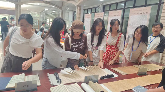 湖北省图书馆(湖北省古籍保护中心)制作了教具,以实物形式现场为师生展示卷轴装、经折装、旋风装、蝴蝶装、包背装、毛装、线装、平装等8种古籍装帧形式;同时还对古籍形制、古籍载体、古籍版式等做了展示科普。湖北省图书馆数字图书馆工作部现场推介古籍特色资源库,开展“古籍巡游记VR体验”活动。