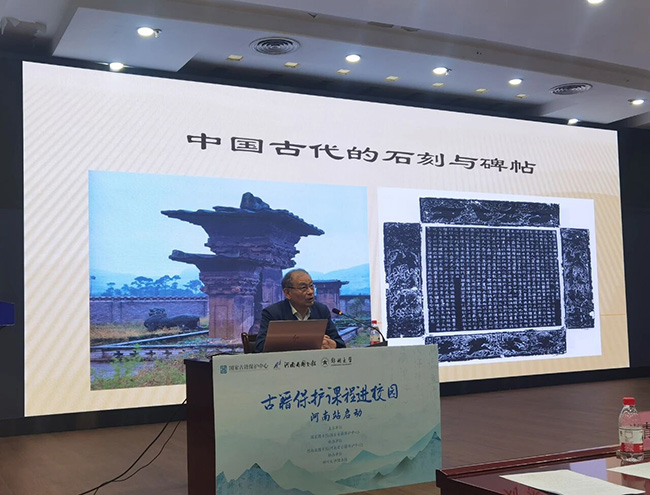 专家授课环节,活动特邀中国社科院考古所研究员、中国社会科学院研究生院教授、石刻研究专家赵超老师带来题为《中国古代的石刻和碑贴》的学术讲座。赵老师从中国古代石刻和碑帖两方面入手,深入浅出地为在场师生们讲解了中国古代石刻的主要类型、什么是碑帖与碑帖的由来以及古代石刻拓本的鉴定方法,希望大家能够喜爱和关注中国古代的文化珍宝——石刻与碑帖,感悟中华优秀传统文化的独特魅力。