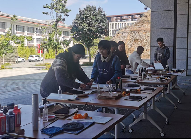 活动现场,雕版印刷和传拓技艺体验活动、“古籍文会·诗礼雅集——诗契·句读·书签”手作活动,以及“贵州民族大学图书馆藏珍稀文献特展”“贵州民族大学图书馆古籍修复成果暨文创产品展”同步开展,参会师生们在工作人员的指导下,亲自动手体验了传拓和雕版印刷,进一步感受中华传统文化的魅力。