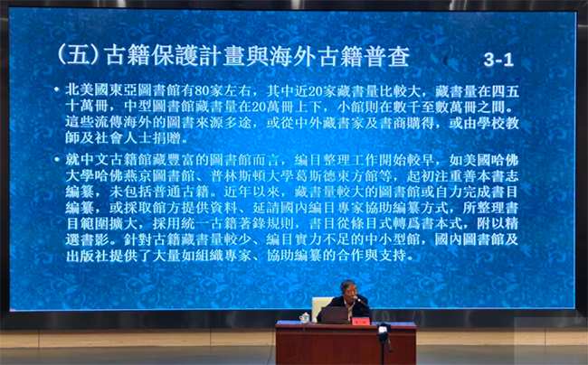 启动仪式结束后,复旦大学古籍保护研究院吴格教授带来题为“北美地区中国古籍的收藏与调查”的专题讲座。吴格教授围绕中国古籍北美地区传存状况、北美地区中国古籍编目成果、洛杉矶加大东亚馆编目介绍等方面,为在场师生系统梳理了北美地区中国古籍的相关研究成果与实践经验。整场讲座内容详实、逻辑清晰,不仅让在座师生全面了解了北美地区中国古籍的收藏与调查现状,也为古籍保护与研究领域的学术交流搭建了有益平台。