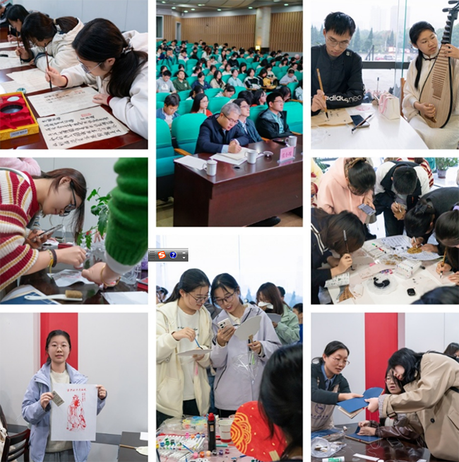 与学术讲座同步,逸夫图书馆大厅的展示与体验区热闹非凡。活动设置了线装书装订、活字印刷、雕版印刷、拓印、专属馆藏字帖临抄、漆扇制作等传统工艺体验项目,还特别加入了学生社团带来的甲骨文书签 DIY、甲骨文飞行棋、古籍函套制作、传统香囊制作等特色活动。