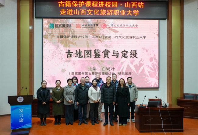 11月25日,“古籍保护课程进校园·山西站”活动第五场讲座在山西文化旅游职业大学举办。本次活动由国家图书馆(国家古籍保护中心)、山西省文化和旅游厅主办,山西省图书馆(山西省古籍保护中心),山西文化旅游职业大学文化艺术管理系、马克思主义学院承办,邀请国家图书馆古籍馆舆图组组长、研究馆员白鸿叶作嘉宾讲座。
