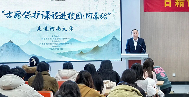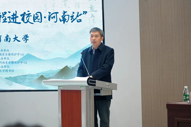 12月9日上午,由国家图书馆(国家古籍保护中心)主办,河南省图书馆(河南省古籍保护中心)承办,河南大学图书馆协办的“古籍保护课程进校园·河南站”活动在河南大学金明校区举行。北京师范大学历史学院教授周少川,河南省图书馆党委书记、馆长李勇,河南省图书馆副馆长刘杰,河南大学图书馆馆长李恒、副馆长邱建章、副馆长于兆军等领导以及河南大学的百余名师生共同参与本次活动。