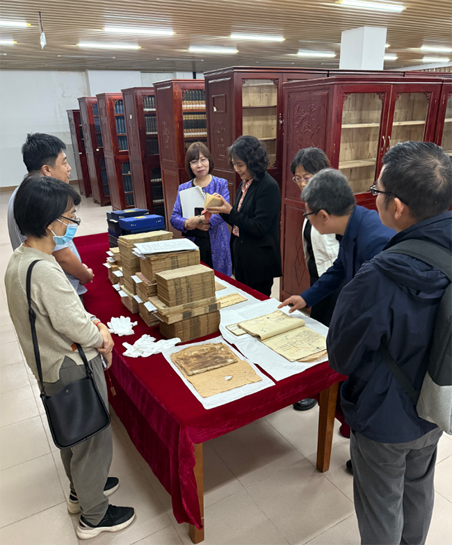 讲座结束后,王红蕾等嘉宾一同到古籍书库进行参观指导。一行人观看了海南大学图书馆珍藏的更路簿等文献,就古籍特藏文献保护和开发研究进行深入的对话和探讨。王红蕾对古籍保护问题进行指导,助益海大馆古籍保护工作。