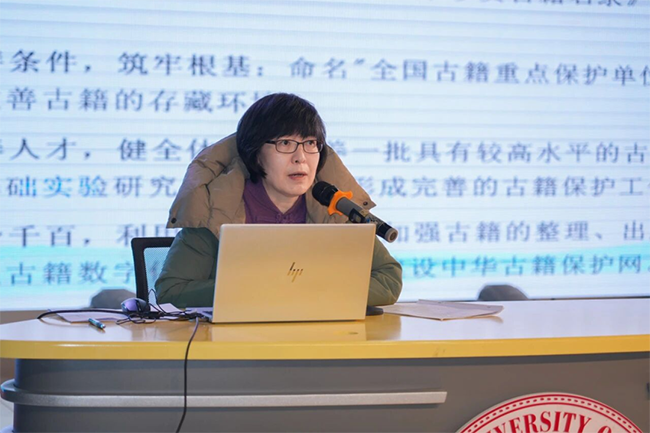 专家授课环节,活动特邀国家古籍保护中心办公室孙婠副研究馆员作了题为《守护文脉 故纸新生》的专题讲座。孙婠回顾了自中华古籍保护计划实施以来,在古籍普查登记、分级保护体系建设、古籍保护人才培养体系建设等方面取得的成果,解析了古籍破损定级标准、修复设施设备以及修复流程等。生动的讲解使师生对古籍保护、传承与利用有了更为清晰的认知。