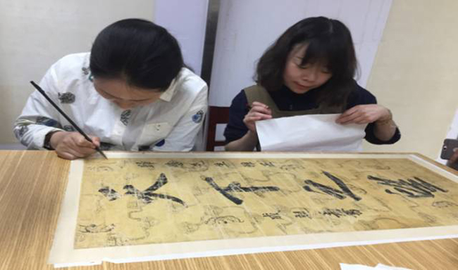 在修复成亲王字画的过程中,徐建华老师主要根据字的破损情况,重点指导学员实践了书画返铅状况的处理、书画断裂状况的处理,并按照修复的基本流程,指导学员实践了染纸、染绫、揭画心、全色等书画修复装裱的基本工序。