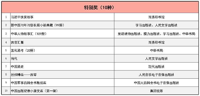 第十届中国出版集团出版奖评选工作从中国出版集团2019年以来出版的3万余种出版物中,精选出100种紧扣主题主线、弘扬时代精神,在传播党的创新理论、巩固壮大主流舆论、满足人民精神文化需求、提升国家文化软实力等方面发挥了积极作用,作出了突出贡献的精品力作。