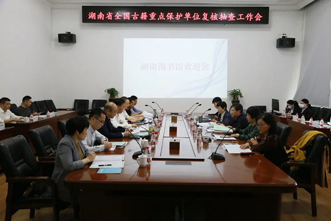 湖南省共有湖南图书馆、湖南师范大学图书馆、湖南省社会科学院文献信息中心(图书馆)三家全国古籍重点保护单位。湖南省文化和旅游厅高度重视此次复核抽查工作,对工作进行了周密部署和精心组织。此次复核抽查工作组莅临现场考察,必将更好地指导和推动湖南省全国古籍重点保护单位工作的进一步开展。湖南省将以此次全国古籍重点保护单位复核抽查工作为契机,进一步贯彻“保护为主、抢救第一、合理利用、加强管理”的指导方针,加强科学规划,加大工作力度,把复核抽查发现的问题迅速整改到位,把专家组提出的要求真正落实到位,认真领会中共中央办公厅、国务院办公厅《关于推进新时代古籍工作的意见》的文件精神,切实做好珍贵古籍的保护、管理和合理利用工作,推动我省古籍保护事业稳步发展,使中华民族珍贵的文献典籍永泽后世。