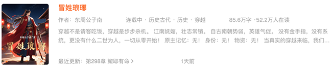 《冒姓琅琊》是国家图书馆与番茄小说“走进古籍,看见历史”征文获奖作品,同时登上了番茄小说巅峰榜。该作品聚焦南北朝南齐这一“冷门”历史时期,以穿越者王扬“冒姓琅琊王氏”的生存历程为线索,还原了中古时期的社会制度、生活习俗与文化风貌。根据番茄小说方面透露的数据,该作品累计吸引超500万读者,近期在读人数超50万,打破了“冷门历史无人问津”的偏见。