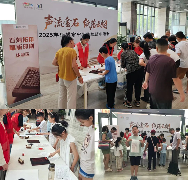 一楼大厅的雕版印刷、石刻拓印体验区,自活动开始便排起了长队,成为最受市民欢迎的“互动打卡点”。在工作人员的耐心指导下,市民们拿起毛刷,在印有《齐民要术》农事智慧、《聊斋志异》经典片段的特色木雕版上轻轻刷墨,再小心翼翼地铺上宣纸,用工具轻轻按压——当揭开宣纸的瞬间,清晰的文字跃然纸上,不少市民发出惊喜的赞叹。另一边的石刻拓印区,大家对着《兰亭集序》《赤壁赋》石质拓板,手持打刷细心敲打,感受着墨色在纸上慢慢晕开的过程,体会石刻拓印“慢工出细活”的独特乐趣。