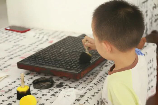 五楼大厅的“传统技艺体验工坊”成为活动最热门的区域,线装书制作、雕版印刷、活字印刷、漆扇绘制、书画创作五大体验项目前,师生们有序排队,亲手感受传统技艺的精妙。