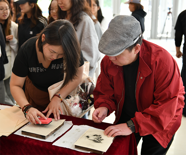 同期,行政楼大厅开展了古籍修复技艺体验活动。内蒙古自治区图书馆古籍保护中心工作人员现场展示雕版印刷、活字印刷、拓印等体验活动,师生现场观摩并亲自动手学习技艺。
