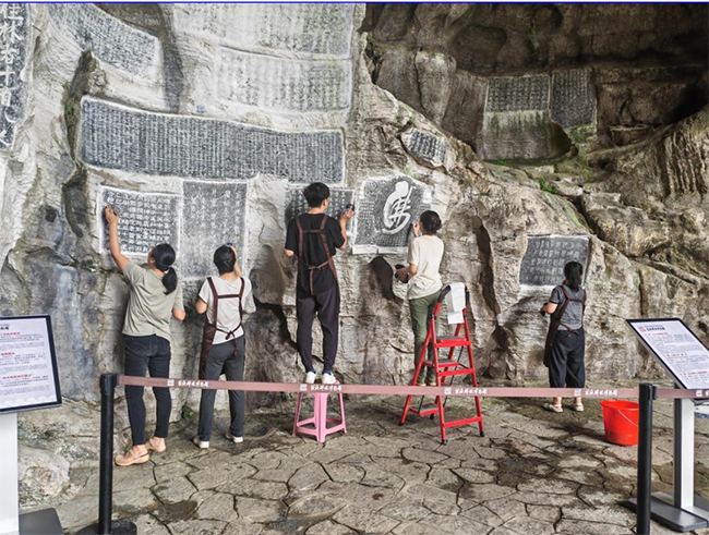 为促进广西地区石刻传拓技艺交流与发展,桂林传习所师徒协力,开展延伸教学与合作。学员们跟随韦可祥老师赴来宾市忻城县、桂林市灵川县等地开展石刻考察工作。通过石刻文献田野调查,既保护了当地的石刻文化资源,又助力了地方馆藏资源建设。目前,部分学员已经开始与广西区内市、县的文保单位合作,自主进行石刻保护方面的田野调查与学术研究,为地方石刻文献的保护贡献力量。