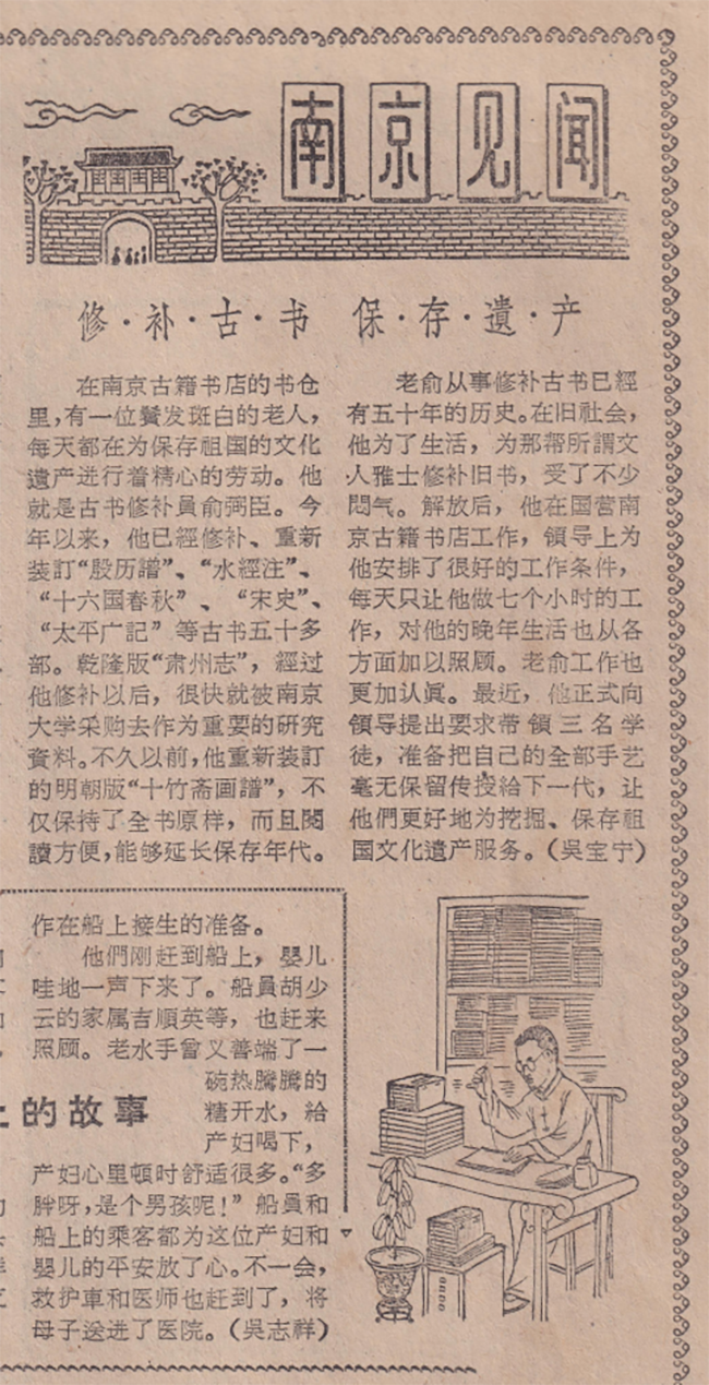 老俞从事修补古书已经有五十年的历史。在旧社会,他为了生活,为那帮所谓文人雅士修补旧书,受了不少闷气。解放后,他在国营南京古籍书店工作,领导上为他安排了很好的工作条件,每天只让他做七小时的工作,对他的晚年生活也从各方面加以照顾。老俞工作也更加认真。最近,他正式向领导提出要求带领三名学徒,准备把自己的全部手艺毫无保留传授给下一代,让他们更好地为挖掘、保存祖国文化遗产服务。