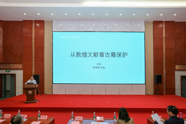作为“‘古籍保护课程进校园·江西站”内容之一,国家图书馆古籍馆研究馆员刘波作了《从敦煌文献看古籍保护》的学术报告。报告通过大量图片和实例,系统梳理了从写本时代古籍保护实践到当代修复原则与方法论确立的完整知识谱系,为现场师生带来了一场学术盛宴。