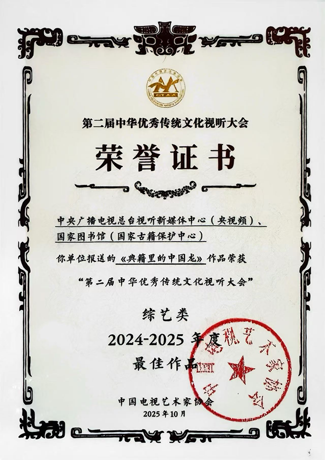 由中央广播电视总台视听新媒体中心(央视频)、国家图书馆(国家古籍保护中心)报送的《典籍里的中国龙》作品荣获“第二届中华优秀传统文化视听大会”综艺类最佳作品奖项。