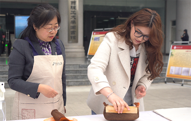 在互动体验环节,国际发展与教育学院院长余丽教授带动留学生们融入活动,双语交流引导俄罗斯、塔吉克斯坦等国留学生了解雕版印刷技艺流程,鼓励大家大胆动手尝试,留学生们在实践中真切感受中华古籍文化的独特魅力。