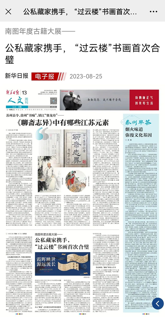 为贯彻落实习近平总书记在文化传承发展座谈会上的重要指示精神,积极响应“江流万古 文润千年——2023年中华传统晒书活动”的总体要求,南京图书馆(江苏省古籍保护中心)积极发挥古籍保护和传承职能,与苏州过云楼顾氏家族、江苏凤凰出版传媒集团有限公司精诚合作,集三家收藏之精华,共同举办“霞晖映世 源远流长——百年‘过云楼’古籍书画精品合璧展”。