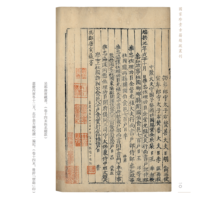 隨著古籍研究不斷深入擴展,存世的海量古籍題跋逐漸受到藏書家及目録學、版本學、書籍史、文化史研究者的注意,對其進行的整理工作如著録、輯存、校釋等綿延不絶,嘉惠學林者往往而有。然而古籍題跋的存在形式具有唯一性,又分藏各地,讀者若要使用,非親至其地、親閲其書而不能,其釋讀利用亦需具備專業知識,故而其價值亦難得到充分揭示。傳統上對題跋的整理,大多因人、因書、因庋藏流轉而搜求題跋,分門别類,釋讀著録,雖已有收藏單位持續開展整理工作,但仍待全國範圍内的大規模整理與系統公布。《國家珍貴古籍題跋叢刊》即是從國家珍貴古籍入手,以《國家珍貴古籍名録》評審工作爲基礎,對古籍題跋進行全面查考輯録及釋讀整理的新探索。《國家珍貴古籍名録》是由國務院公布的我國現存珍貴古籍目録,旨在集中人力物力,對具特别重要的文獻價值、文物價值、藝術價值的古籍予以重點保護。自二〇〇七年“中華古籍保護計劃”開展以來,已正式公布五批,涵蓋全國四百五十八家單位(個人)所藏一万二千二百七十四部古籍。入選典籍爲國内存世古籍中具有代表性的精品,多經名家遞藏、高士品鑒;而與此同時,名家題跋本又常以其獨特價值而受到特别關注。因此,《國家珍貴古籍名録》所含題跋,可謂數量繁多、質量精良、多出名家,但在傳統書目中往往散在群書之間,著録失於簡略。對這些題跋進行全面整理,不僅對紹介珍貴古籍、提供研究資料頗具價值,對題跋整理工作而言亦可起到重要的示範作用。