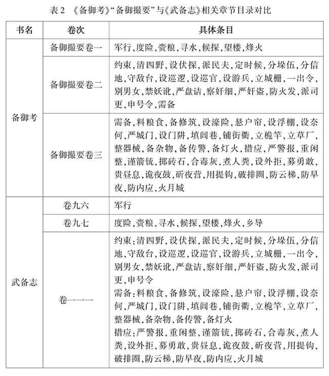 如前所述,丁若镛的这种构想,最终是以三部书的形式呈现的。但这三部书其实未能以完整形式出版,仅仅是被整理完成。其中,奎章阁所藏李重协辑《备御考》10册与《武备志》在内容上的联系非常密切。其第1册“备御撮要”三卷全部内容都是对《武备志》相应章节的全文抄录。为便于比较,将二书相关章节目录情况列为表2: