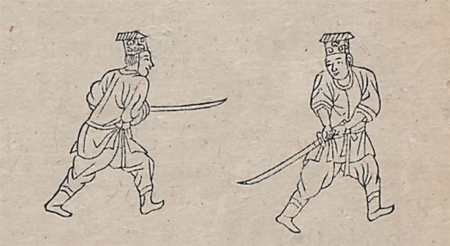 总之,无论是《武备志》图谱的呈现方式,还是茅元仪的武艺解说,都是《武艺图谱通志》的重要知识来源和借鉴对象。在此基础上,朝鲜编纂者又为进一步提升此兵书的可读性、适用性和本土化程度做出努力。对于这一点,除对“锐刀谱”的改创外,还有一个不可忽视的例子是图示中人物服饰和所持武器的样式。在《武艺图谱通志》中,所有图示人物的服饰均与《武备志》不同。图6为《武备志》“朝鲜势法”图谱中的人物形象,其衣服、帽子和鞋子均有很明显的中国特色,如他们头上戴的是明代(特别是晚明)盛行的唐巾。图7为《武艺图谱通志》 “锐刀谱”中的人物形象,人物动作虽与《武备志》一致,服饰却已变为典型的朝鲜传统风格,如他们所戴的帽子即为朝鲜“战巾”。除服饰外,两部兵书中人物所持的武器也相异:《武备志》图示人物手持两刃剑,而《武艺图谱通志》图示人物手握环刀,这应与环刀在朝鲜极高的流行度和使用度有关,如书中所载:“环刀,即中国之腰刀也……大抵剑是古制而可用于今,腰刀今之所尚,而其用甚博,故并录其名物及锻冶之法焉。”