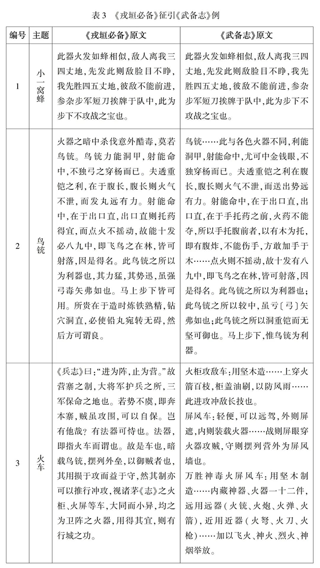 如表3所示,《戎垣必备》对《武备志》的征引可分为三种模式:其一,直接完全按照《武备志》原文抄录所需内容,如第1条;其二,对《武备志》中相关论述进行缩写、删减后形成概括性内容,且概括后仍遵循茅元仪的行文顺序与逻辑,如第2条;其三,在论述中提及《武备志》中的相关内容进行对比论证,如第3条。