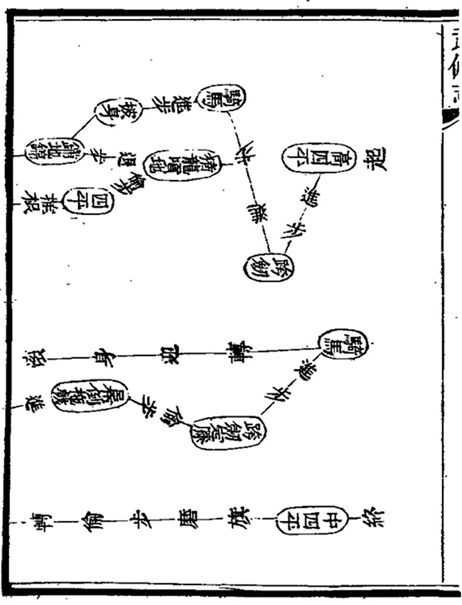 《武艺图谱通志》凡例称:“旧谱有散图而无合图,今仿《武备志》诸势总谱例作谱,而《武备志》之圈书势名者,悉代以图。”即《武艺诸谱》和《武艺新谱》只有散图(如图1所示),没有合图,而《武艺图谱通志》仿效《武备志》中“诸势总谱”的式样制作图谱,以路径图的形式有序地对势法名称进行整体呈现。茅元仪在论及棍法时即配有大量此类势谱(如图2所示)。《武艺图谱通志》全面继承了这种势谱的绘制方式和技艺,并将此法运用在“图”的呈现上,制作出有逐步演练过程的各武器训练总览图(如图3所示)。这种路径图式有序、集中的显示,可以大大减轻阅读或理解的障碍,帮助那些不懂汉语或者文化水平较低的士卒进行武艺训练,与朝鲜统治者“欲令将领卒伍,人人易晓”的目标相契合。与此同时,《武备志》图谱的“生命”通过这种新的形式得以延续。