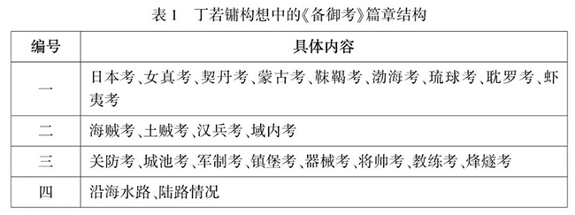 丁若镛对《备御考》的原始构想被完整记录在他写给儿子的信件之中。1808年,他在《示二子家诫》中明确提到自己受《武备志》的启发,欲编纂《备御考》:“茅元仪《武备志》,非十分综核之书。然我邦尚无是编,意欲仿其门目,别撰东方备御之书,雅志蓄中,流落以来,书籍莫获,遂不能着手。汝曹既知余意,须谋编辑,以造胚膜。幸余得生还故里,得以鉴定删润也。地理诸条,略已就绪,不甚贻汝曹劳也。”他想要仿照茅元仪《武备志》的篇章结构编纂属于朝鲜自己的国土防御书籍。可见《武备志》不仅是他的灵感来源,还是他进行章节设置的模板。在被流放后,他因手边没有《武备志》而无法展开全面的编纂工作。因此于此信结尾处和《寄两儿》一信中向两个儿子说明编纂《备御考》的必要性、自己的构想和具体操作指南,指示两个儿子开展编辑工作。丁若镛在信中所述的对《备御考》篇章结构的基本构想如表1所示: