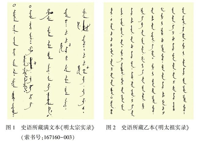 林士铉曾撰文对史语所藏太宗、宣宗两朝满文本《明实录》作过介绍,并选取其中部分内容与汉文《明实录》对读,得出以下三点基本认识:一,满文本《明实录》中的族名、人名、地名等基本依照汉文读音直译;二,满文本《明实录》完整保存了汉文本《明实录》的内容;三,满文本《明实录》同时保留了“老满文”与“新满文”的书写风格。由于林文只是以《明太宗实录》及《明宣宗实录》为对象进行的初步研究,对满文本《明太祖实录》并未予以论述,故本文还需在此基础上对其整体情况与传抄系统略作考察。
