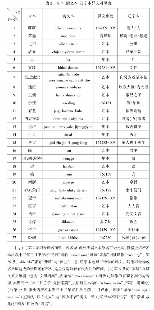 本节将辽宁本与今本《明太祖实录》的文字与内容进行对比,先见其异同,再借满文本《明实录》的相同译文对这些异同(与舛误)予以尽量合理的解释。选取辽宁本中具有译文特征的语素讹误(包括误写、衍文、圈改等)或与今本文义有明显出入之处,以现存满文《明实录》的译文进行检验。