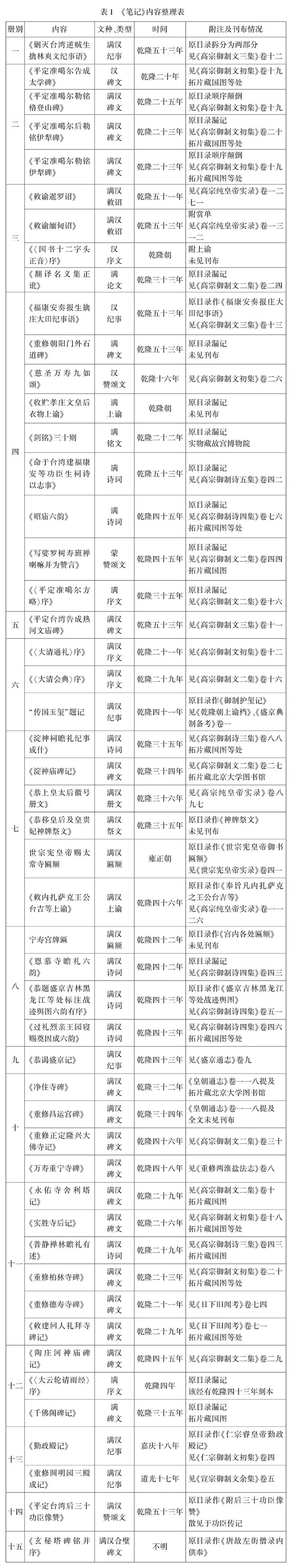 本文考论国图所藏《庙碑记事笔记》,确认该书收录满汉文献五十种,包括碑文、纪事、序文、赞颂文、敕诏、上谕、匾额、诗词、铭文、册文、祭文、论文十二个类别,涉及雍正、乾隆、嘉庆、道光四朝。全书基本是以辑自内翻书房的满汉翻译底稿散件陆续拼凑而成,部分文献可能是底稿原件,缮写并非出自一人之手。其中前十二册应系乾隆、嘉庆朝所辑,后三册系道光朝所辑,最终成书约在道光朝后期,原目录则可能是成书后另由他人补入,甚至可能是后世整理者所作。简言之,《笔记》是内翻书房或与内翻书房相关人员辑录的满汉翻译底稿集(唯第十五册的作者和来源目前存疑),创作目的可能是作为后续翻译工作的参考,其文献性质罕见,内容丰富,收录有《〈国书十二字头正音〉序》等未刊文献;可以补充部分史事;大量满汉译本及批注,则可展现内翻书房的翻译流程,并反映御制诗文的创作与翻译情况,具有重要文献价值,值得学界重视并展开深入研究。