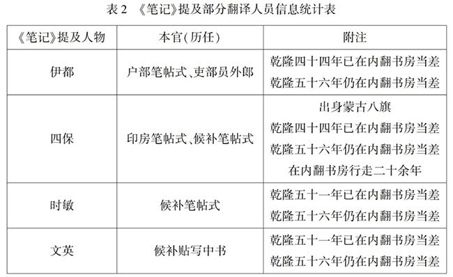 考诸典籍,清代军机处辖下的翻译机构是内翻书房,专为皇帝翻译满汉文书,初设于康熙年间,自乾隆三十六年归入军机处辖下,宣统三年(1911)改隶翰林院。内翻书房设有提调官、协办提调官、收掌官、掌档官、兼行走官、翻译官等,均系兼任之差使。据《钦定大清会典》所载:“凡谕旨,清字则译汉,汉字则翻清,各衙门抄出于内阁者,皆录送以翻译。起居注应翻应译者亦如之。皇帝御经筵,则翻御论与其讲章。若册文,若敕文,若祝文,若祭文,若碑文,皆翻焉。凡经史有旨翻清者,则纂辑以候钦定,御制诗文之敕翻者亦如之。”其归属、职能、负责文献类别与《笔记》内文献及批注内容高度一致,且《笔记》批注中提及的翻译人员亦多见于内翻书房档案。如负责校对乾隆四十六年上谕的富喀善,出身蒙古八旗,精通满蒙文翻译,从乾隆二十六年就在内翻书房当差,本官先后为太仆寺笔帖式、理藩院主事、理藩院员外郎,乾隆五十六年时仍在内翻书房当差,计已效力三十年。其余人物信息详见下表2: