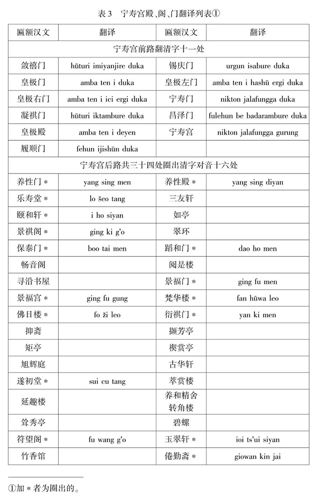 又如清代紫禁城内各处殿、阁、门之匾额,有满汉两种文字者,有满蒙汉三种文字者,亦有仅汉字一种文字者。而同用满文者,又有音译、意译之别。不同地方之牌匾,因何会有不同译法,其翻译规则,学界一直未能明确。《笔记》第八册收录有宁寿宫牌匾清单,实际上是乾隆四十二年宁寿宫重修完毕后,请乾隆帝钦定翻译规则之档案。根据该档案记载,官员将宁寿宫内各处殿、阁、门开单,进呈钦定。乾隆帝览看后降谕,宁寿宫前路建筑十一处,匾额均“翻清字”,即意译为满文;宁寿宫后路建筑共三十四处,用朱笔圈出其中十六处,圈出者“俱著用清字对音”,即音译为满文,而未经圈出者“著用黑漆填金单汉字横匾”。其前路、后路及圈出、未圈之建筑统计为下表3: