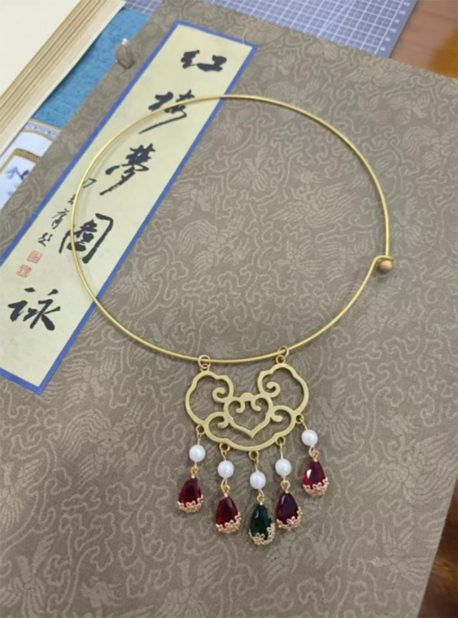 《红楼梦》中花费了大量笔墨描绘人物的服装饰品,十分讲究,其中曾多次出现对于“璎珞”的描写。如宝玉出场时,“项上金螭璎珞,又有一块五色丝绦系着一块美玉”。王熙凤 “头上戴着金丝八宝攒珠髻,绾着朝阳五凤掛珠钗,项上戴着赤金盘螭璎珞圈”。璎珞,又称华鬘,是一种用珠玉串成的装饰品,原为古代印度佛像颈间的一种装饰,后来随着佛教一起传入我国,唐代时被爱美求新的女性所模仿和改进,变成了日常配饰。在历史发展过程中,璎珞除了装饰作用,更成为了一种身份、地位的象征。