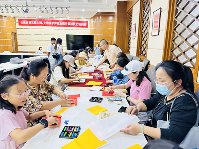 当天还开展了传拓及线装书装订体验活动,数十位体验者满含着对传统文化的热爱参与到体验活动中。活动现场,由昆明市非物质文化遗产代表性传承人张衡为大家讲授传拓基础知识和常见传拓方法,并演示扑拓和蜡墨拓两种传统拓印技艺。随后在张老师的指导下,大家上手拓印,用一幅幅五颜六色的DIY作品展示着文化传承的力量与自信。同时,云南省图书馆几位古籍修复师也在一旁耐心指导读者进行古籍线装书装订体验,那一针一线的穿引,仿佛在穿越古今。大家无不兴致盎然,乐在其中。活动结束后,大家意犹未尽地带着各自的作品满载而归。