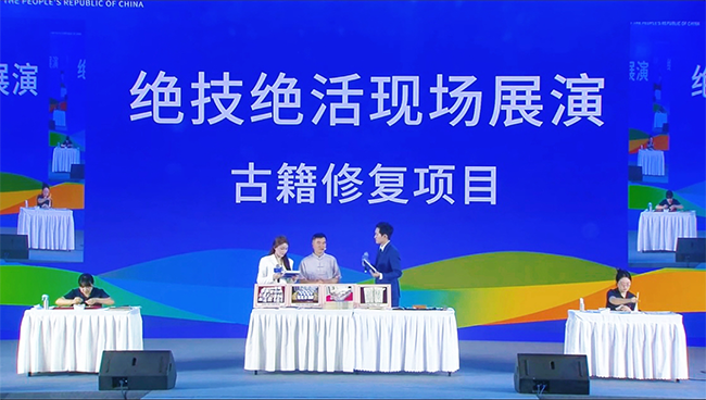 9月20日,绝技绝活展演活动正式开始,这场展演活动是从全国226个项目中优中选优,汇聚40个特色绝技项目,以“T台沉浸式”方式展示。国家级古籍修复传习所导师、甘肃省古籍修复技艺非遗传承人何谋忠携团队成员登台,通过“现场操作+技艺讲解”的形式,让观众直观感受到古籍修复技艺的神奇魅力。现场何老师向观众们介绍古籍修复流程以及背后的故事,通过照片及实物展示,原本破损严重的古籍,在修复后焕然一新,令现场观众惊叹不已。助演人员也进行了细致的现场展示,运用揭、裱、托、补等精细技法,实现“整旧如旧”,让修复痕迹近乎隐形。将技艺的精细、匠心的厚重完美呈现。