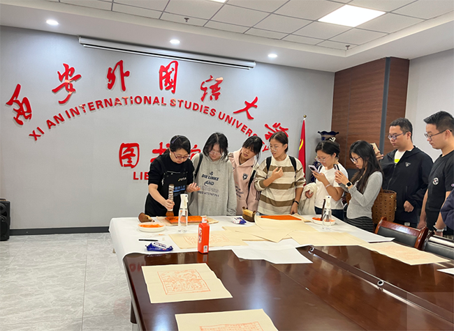 同时,西安外国语大学图书馆举办古籍修复技艺展示体验活动。陕西省图书馆的古籍修复师们现场进行雕版印刷非遗传统技艺展示,通过沉浸式的观摩体验,为广大师生生动讲授了古籍保护和非遗传承知识,激发他们对中华优秀传统文化的热爱。