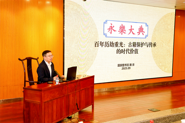启动仪式结束后,国家图书馆副馆长魏崇以“《永乐大典》百年历劫重光:古籍保护与传承的时代价值”为题作了首场专题讲座。他生动讲述了《永乐大典》作为国家图书馆四大专藏之一,从历经战火、流散重聚的百年沧桑,到如今通过专业修复与数字活化重现光彩的再获新生,从而引出古籍保护传承的时代价值。魏崇表示,把祖国宝贵的文化遗产保护好、传承好、发展好,更好传承中华文明、赓续中华文脉,古籍保护任重道远,关键在人,未来在青年。这场兼具历史厚度与时代温度的精彩讲座,让我们看到的不仅是一部古籍的“重生”,更是一个民族对自身文明根脉的执着守护。
