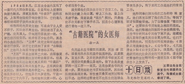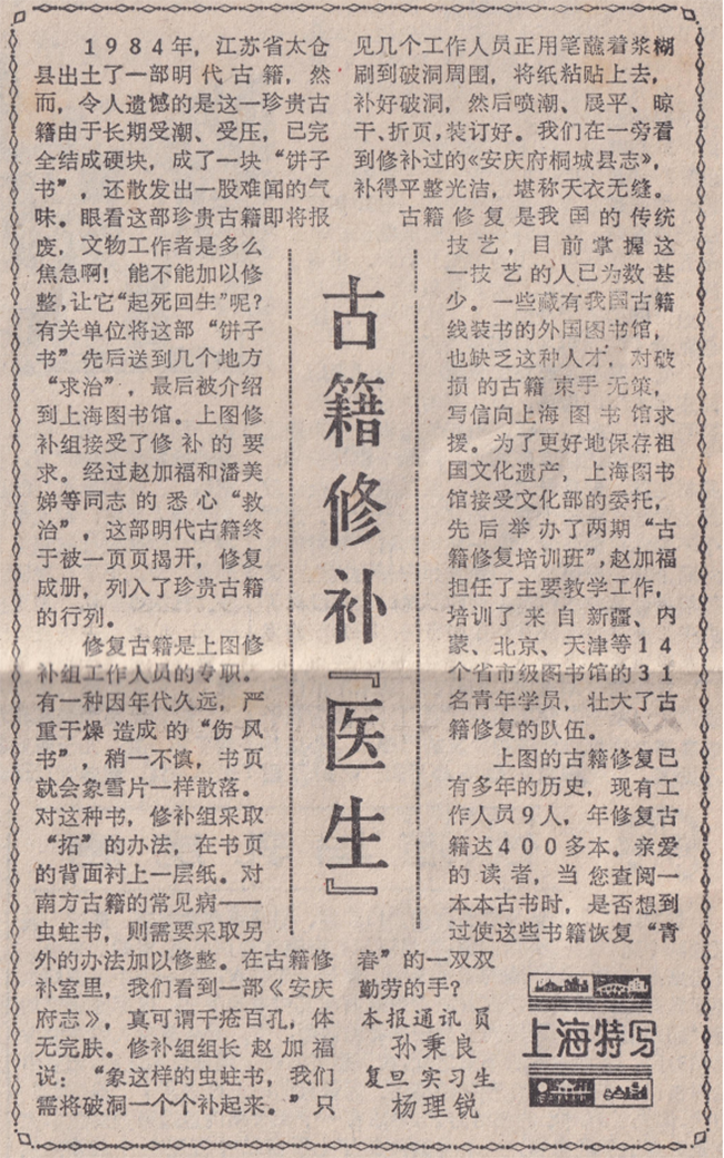 “中华古籍保护计划”启动以前,古籍修复对于公众来说显得十分陌生,相关新闻报道难得一见。陈龙先生多年来关注古籍修复,《与榖为徒》《纸质文献修复与保护书目百种》等先后在本号连载发布,今又将收集到的上世纪九十年代以前老报纸中有关古籍修复相关报道整理投稿,每篇均包括报纸原图及转录文本,共分五期,由本号予以连载,以飨读者。