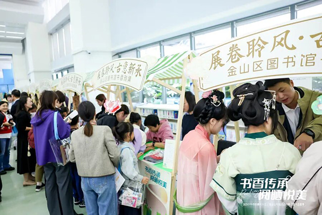 在典藏利用与藏书文化陈列室,读者不仅可近距离观摩馆藏珍本,还能亲手体验线装书装帧、参与刻有金山经典竹枝词的石刻拓印,感受装帧技艺与华夏印刷术的源流演变。地方文化讲习课堂上,晒书主题讲座“淳风还古——竹枝词中的金山清代时令节俗”中,民俗学者以竹枝词作品为媒介,将岁时风俗、市井烟火与乡土情怀化作可感可知的生活图景。