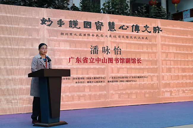 广东省立中山图书馆副馆长潘咏怡在致辞中表示,广东已建设21个基层古籍修复室,潮州开元寺为第22个,也是首次与宗教机构合作的大型古籍保护项目,具有探索意义。当前正值“十四五”收官与“十五五”布局的重要阶段,古籍保护是图书馆事业发展的重点。广东省古籍保护中心将持续推动科学化与系统化进程,并强调古籍保护需依靠行业与社会共同努力。