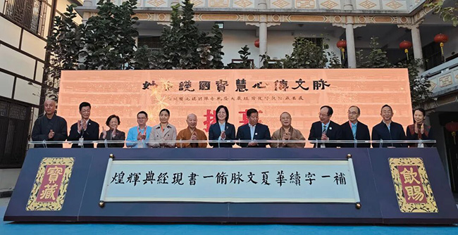 随后,与会领导嘉宾共同推杆启动展览,标志着《大藏经》修复成果展正式面向公众开放。