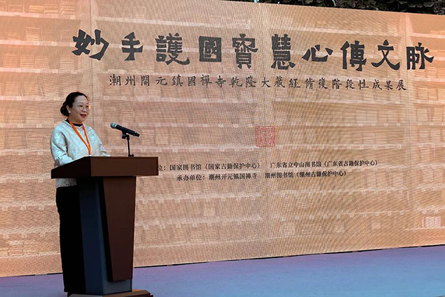 开幕式于下午3点正式启动,由国家古籍保护中心办公室副主任王沛主持。潮州开元镇国禅寺方丈达诠大和尚致欢迎辞,国家图书馆副馆长魏崇通过视频致辞,广东省立中山图书馆副馆长潘咏怡、修复导师代表肖晓梅、香港潮州商会会长高佩璇、广东省佛教协会会长明生大和尚、潮州市人民政府副市长周茹茵等嘉宾先后致辞。