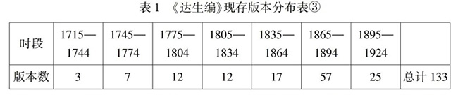 18世纪中叶至19世纪中叶,中国人口迎来大增长,增加2亿有余。而《达生编》在此阶段的出版也持续且快速增加,现存的版本中,1750年以前的有4种,1750年至1850年的则有38种。若以30年为统计单位,《达生编》版本的数量如表1所示: