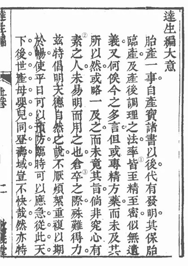 《达生编》二卷,在文本形制和篇章编排上,除“小引”和“大意”外,共包括原生、临产、宜忌、试痛、验案、保胎、小产、产后、胎死腹中、胞衣不下、乳少、格言、方药十多个部分;其中,原生、临产、试痛、保胎、产后、方药是全书重点,其他只有数条。值得注意的是,作者特意将“临产”置于前面,希望起到“以切要者载之首篇,且令开门见山,人人熟习,专意行持,自可无误”的效果,而读者如果想在平时讲说《达生编》,“不妨从保胎顺序看之也”。因此,《达生编》可谓一本规模小、篇幅短、经过精心设计编排的生育手册,后来很多人称其为《达生篇》,应是这种特征的反映。
