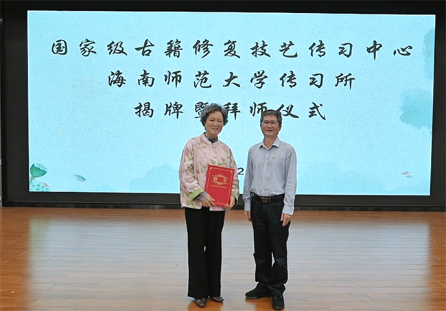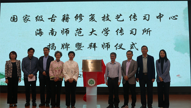 仪式上,萨仁高娃和杨兹举共同为国家级古籍修复技艺传习中心海南师范大学传习所揭牌,杨兹举向肖晓梅导师颁发了聘书。